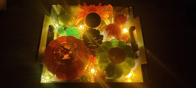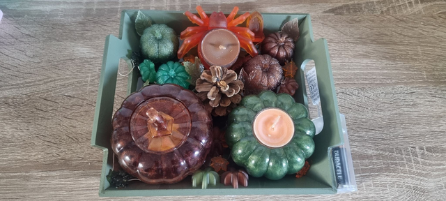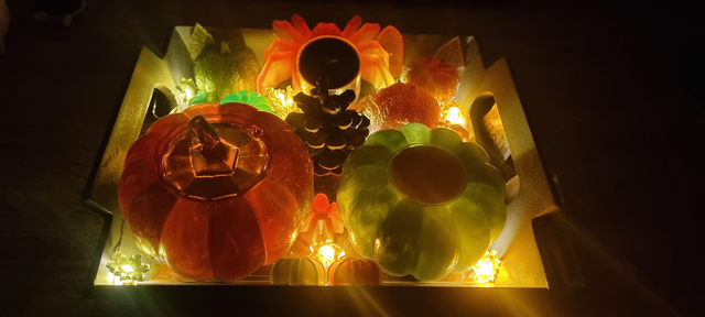 Plateau Halloween avec des araignées, plusieurs citrouilles, une vrai pomme de pain, des feuilles, des lumières en forme de feuilles, des bougies et les piles.
