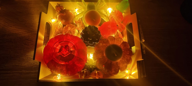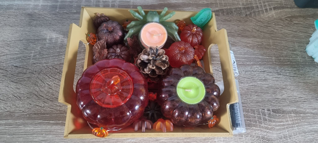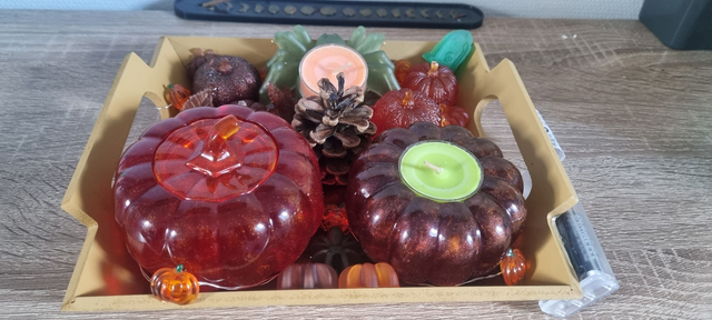 Plateau Halloween avec des araignée, plusieurs citrouilles, une vrai pomme de pain, des feuilles, des lumières en forme de citrouilles, des bougies et les piles.