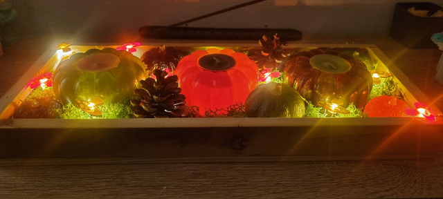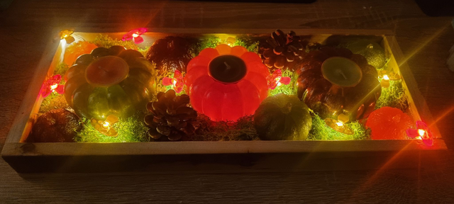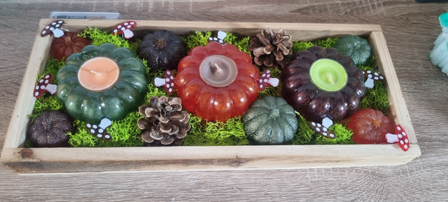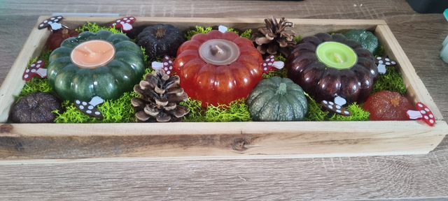 Plateau Halloween, plateau en bois, 3 citrouilles qui sont des supports pour bougies, mousse verte, petites citrouilles, pommes de pains, lumières en forme de champignons, piles et bougies