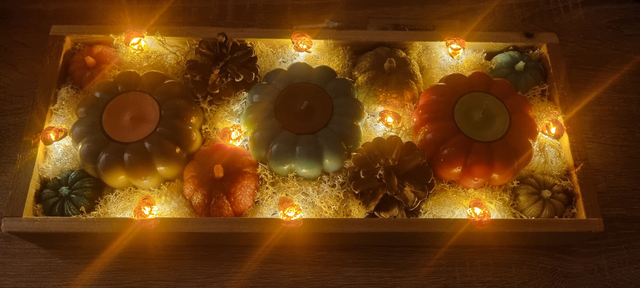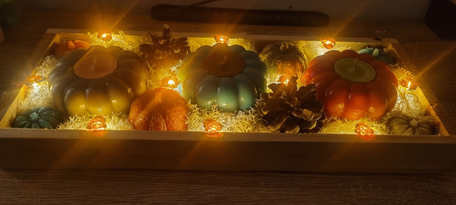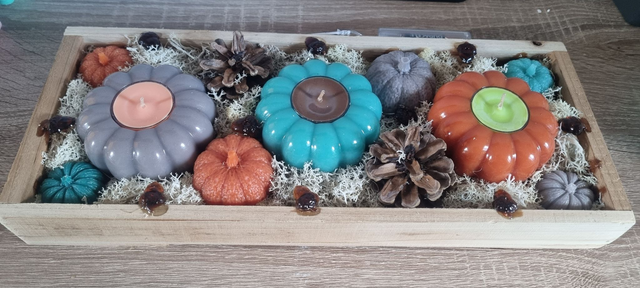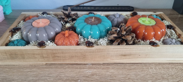 Plateau Halloween, plateau en bois, 3 citrouilles qui sont des supports pour bougies couleur pastel, mousse blanche, petites citrouilles couleur pastel, pommes de pains, lumières en forme de glands, piles et bougies