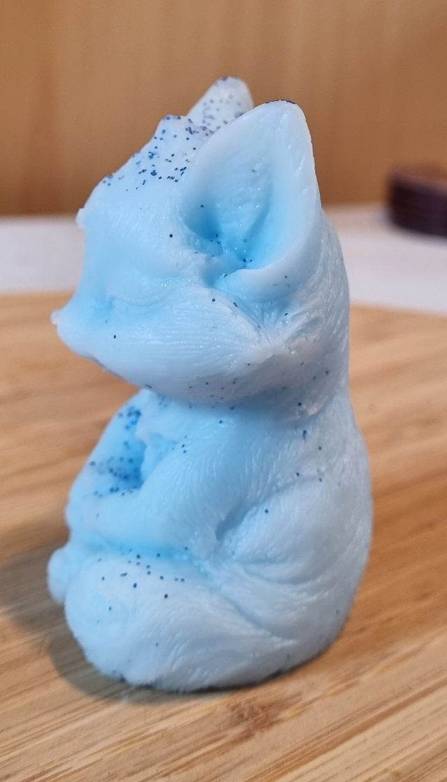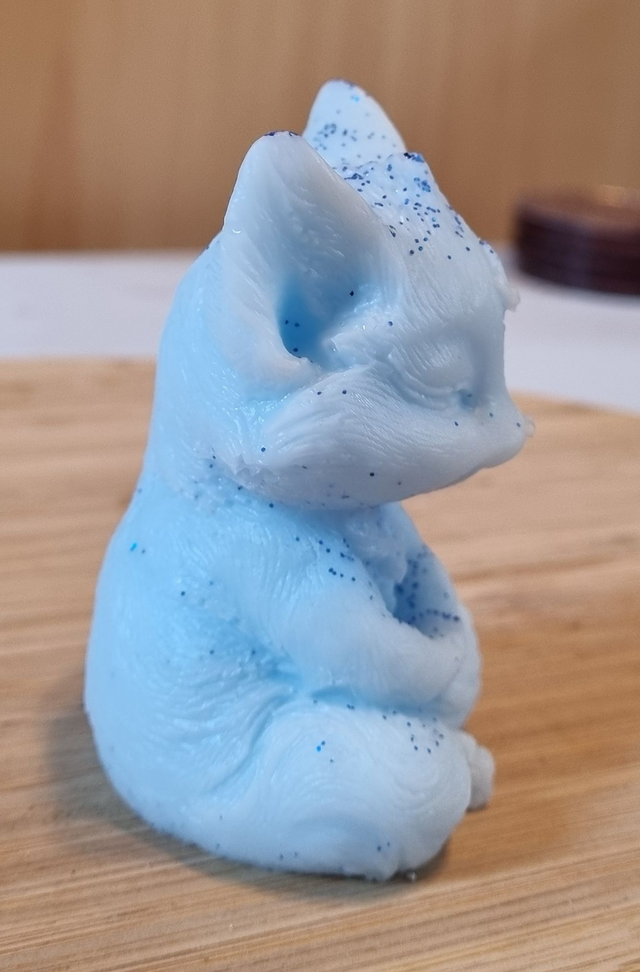 Renard qui médite en résine époxy de couleur bleu clair avec de paillettes bleu foncé.