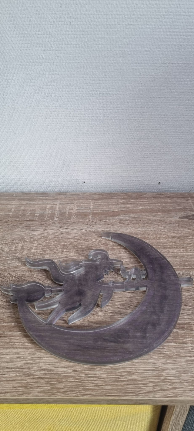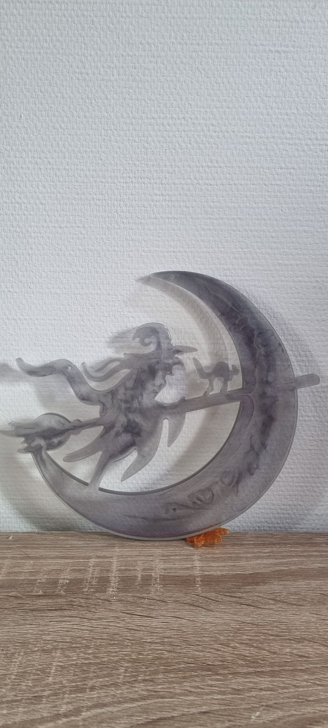Sorcière sur son balais avec son chat, avec la lune. Objet fait en résine époxy de couleur gris/ transparent.