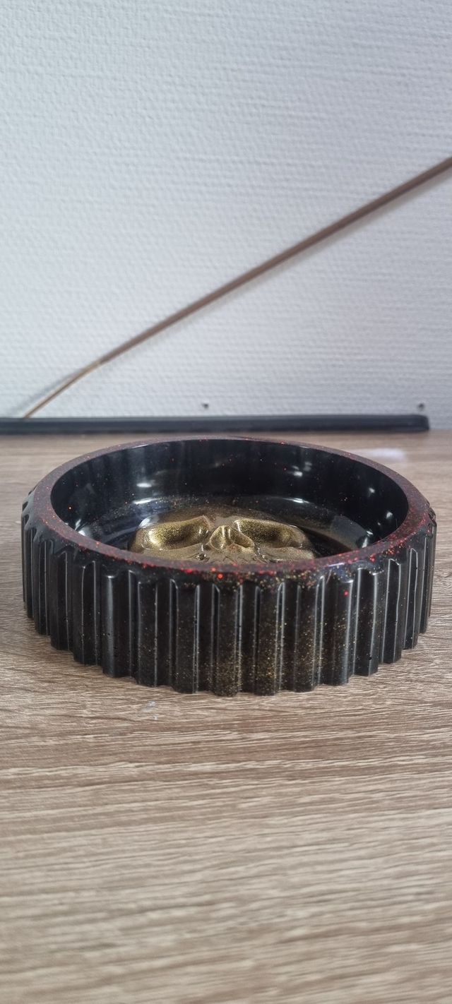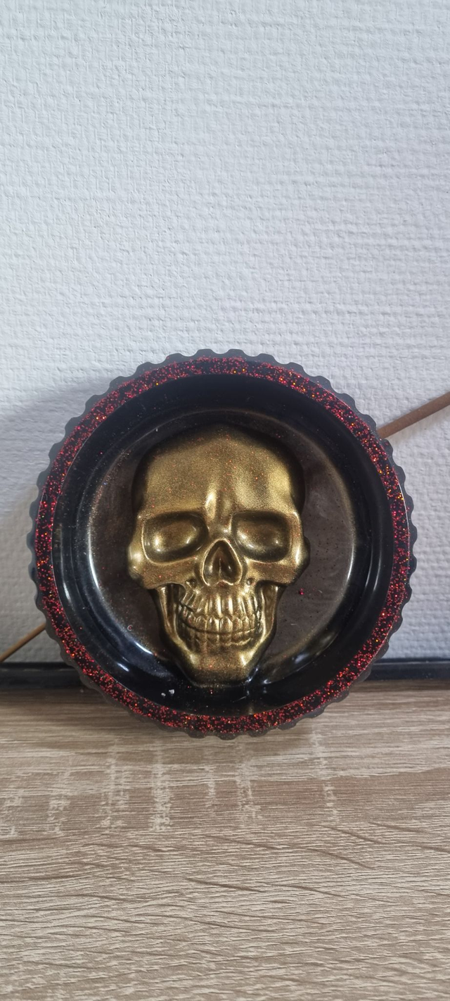 Pot avec une tête de mort en résine époxy de couleur doré pour le crâne, noir et des paillettes rouge