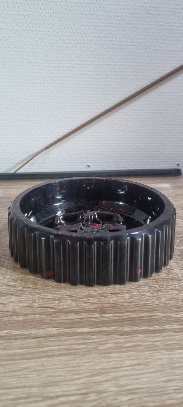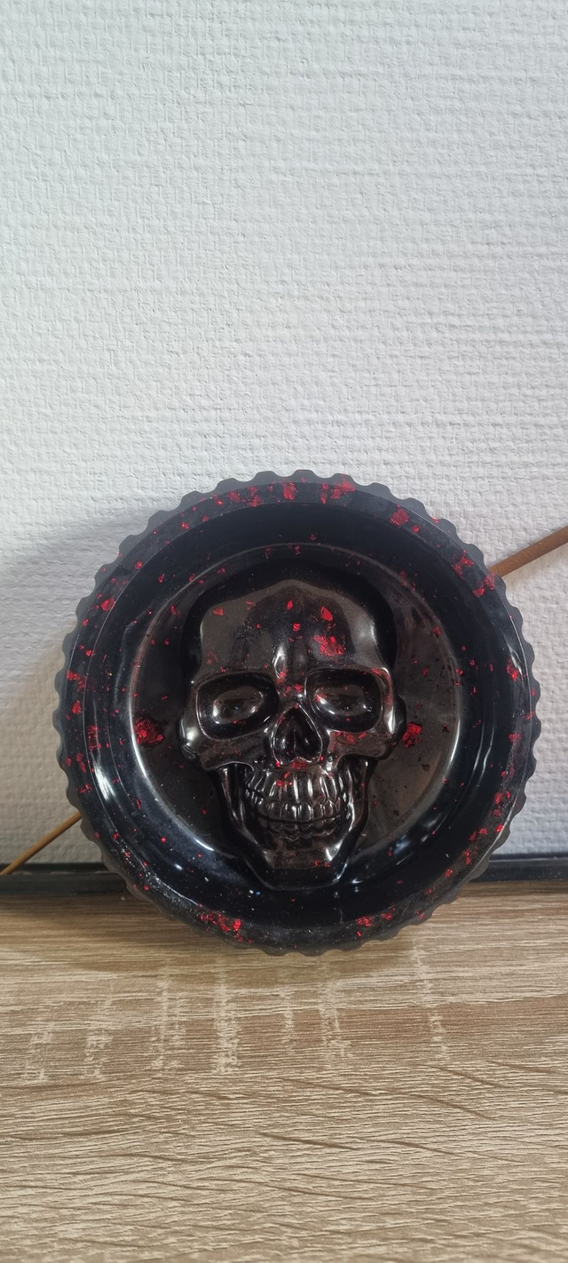 Pot avec une tête de mort en résine époxy de couleur noir avec de feuille d'or rouge